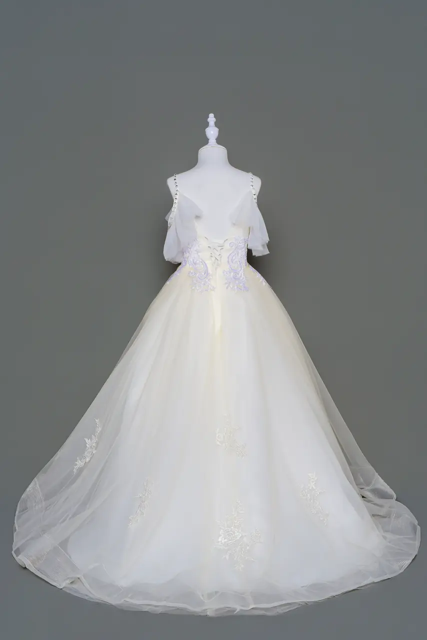 「杏影庭語禮服」是為那場午後婚禮所織的童年記憶,一道米色如同日曬石階上浮動的光影,透過細緻蕾絲刺繡植入手作的詩意。澎裙輕盈展開,彷彿她走過的每一步,都是一段光與風的呢喃。細肩設計猶如悄悄綻放的花苞,疊紗翻折間展現微妙的層次情緒,保有童真的溫柔,也不失典禮中的儀式敬意。這不僅是一件花童禮服,更是一場記憶的層層堆疊,為婚禮光影中最純淨的一幕留白。