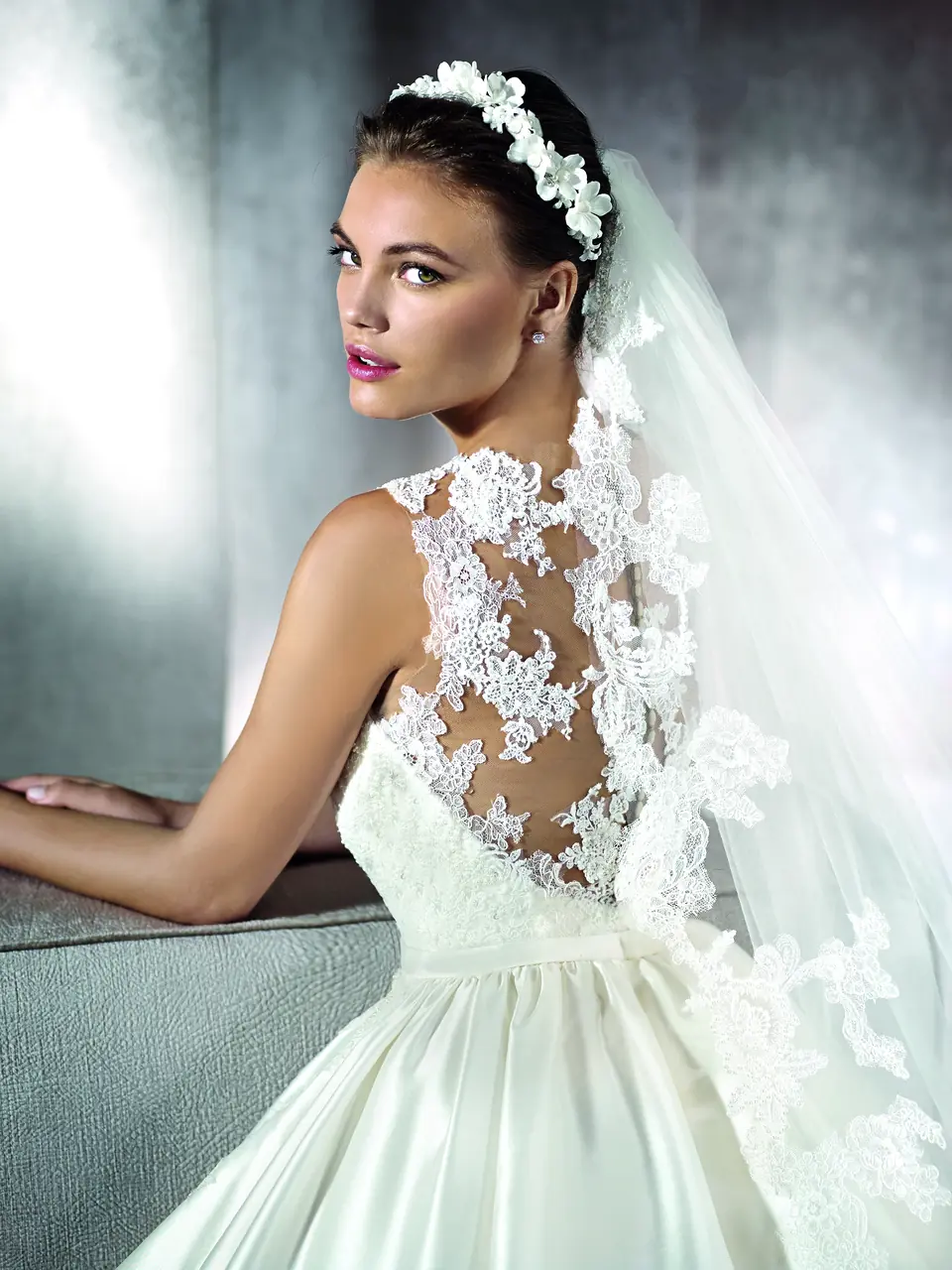 這件婚紗宛如晨霧,裊裊輕舞於花園小徑。澎裙的流動讓新娘如同在夢境中舞蹈,而緞面的光澤與V領的設計則如同初曦的黎明,輕盈卻充滿力量。當她輕輕轉身,身後紗裙如霧般輕擁,承載著那抹微笑與一生的誓言。
